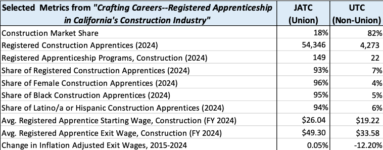 | Analyzing US Department of Labor data on nearly 60,000 registered construction apprentices across 30 trades and 171 individual programs in California, Dr. Petrucci was able to identify significant distinctions between the JATC and UTC training models. “From enrollment and expanding workforce supply from historically under-represented demographics, to wages that attach workers to careers in the industry and keep pace with rising costs, the data is pretty clear that the unionized side of California’s construction sector is punching well above its weight,” Petrucci added. “As the industry grapples with historic demand for construction services and enough skilled workers to get the job done right, the data is pretty unambiguous about which training model is delivering the best outcomes.” In addition to comparing outcomes between the Joint and Unilateral training models for training construction apprentices, Petrucci also compared outcomes associated with Registered Construction apprenticeships more broadly with other workforce training institutions—such as four year college degrees. | ||